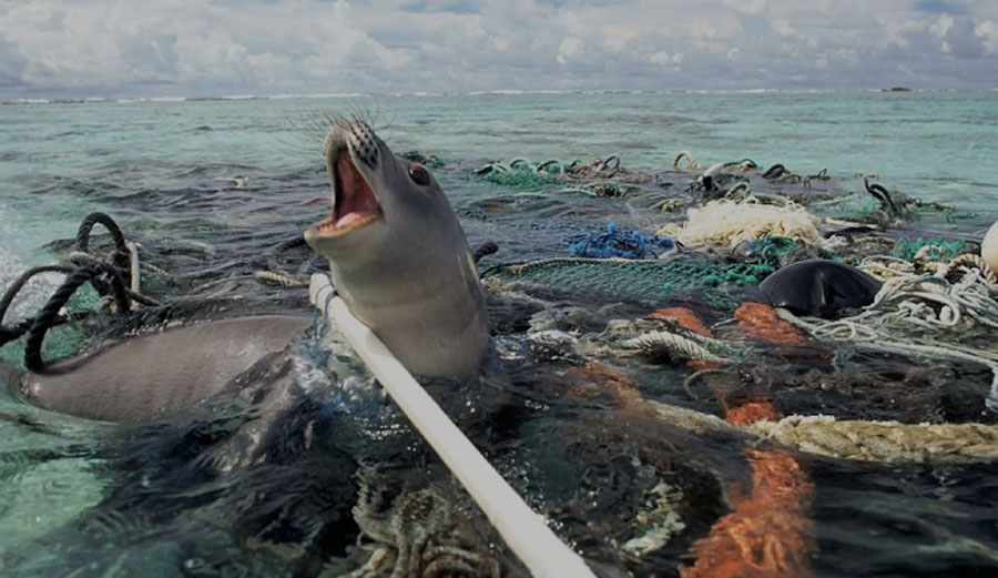 A seal trapped in a mat of plastic pollution. Image: Creative Commons