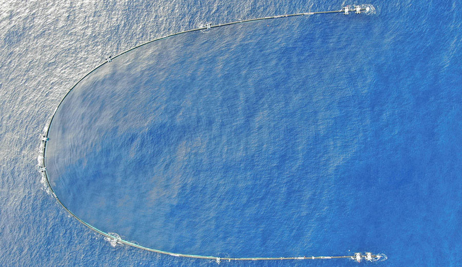 An aerial image of The Ocean Cleanup’s giant boom. Image: The Ocean Cleanup
