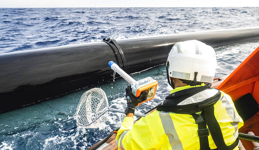 An Ocean Cleanup Project crew member retrieves a GPS drifter from the water. Early findings show that the plastic isn’t staying in the boom. Image: The Ocean Cleanup