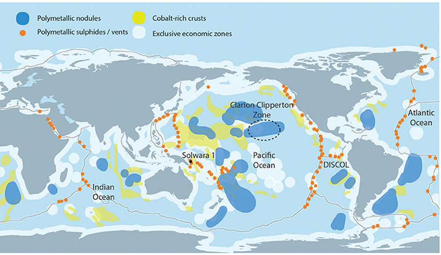 Deep sea mineral deposits: polymetallic nodules – the potato-sized lumps – are in blue; cobalt crusts in yellow; vents in red. Image: Miller et al (2018) / Frontiers in Marine Science