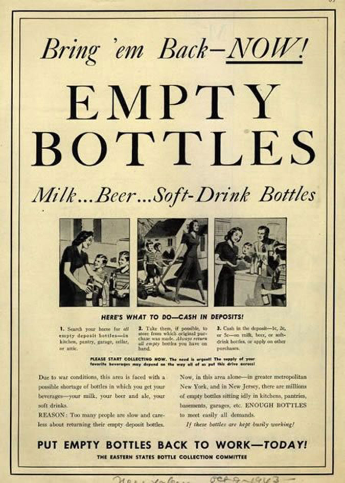 Ad from the ’40s: “[there are] ENOUGH BOTTLES to meet easily all demands … if these bottles are kept busily working.’