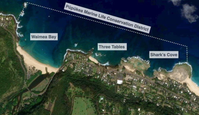 Three Tables, Shark’s Cove, and Waimea Bay are all part of the Pūpūkea Marine Life Conservation District (MLCD), making them marine protected areas. Shark’s Cove and Three Tables were given the designation in 1983 as part of the establishment of the Pupukea MLCD. It was expanded in 2002 to cover more than 100 acres, which included Waimea Bay. While the areas are popular tourist spots for snorkeling and diving, taking any form of marine life (fishing), sand, or coral is prohibited within the MLCD.