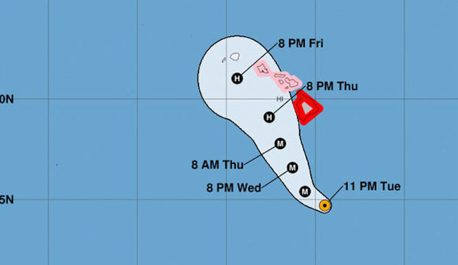 A Hurricane Warning is currently in effect for the islands of Hawaii (or, the Big Island), Maui, Lanai, and Molokai. And a Hurricane Watch has been issued for the islands of Kauai and Oahu.