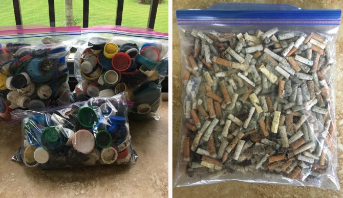 In the seven days I walked the beach I was able to collect 3,035 pieces of trash. 1,392 individual pieces of plastic, 564 cigarette butts, 527 plastic bottle caps, 137 plastic straws, 88 pieces of Styrofoam, 73 pieces of fishing tackle and rope, 55 aluminum cans, 55 plastic bottles and containers, 44 paper products, 27 plastic utensils, 21 glass bottles, 15 balloons, 14 plastic beach toys, 14 sandals, and 9 pieces of clothing.