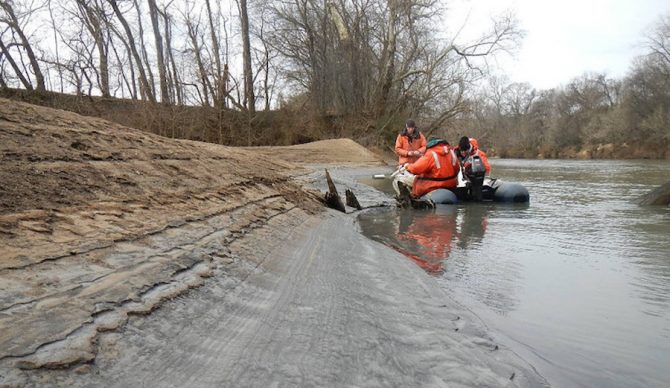 Taking core samples at the site of a coal ash spill on the Dan River in North Carolina, 2014.