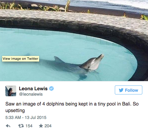 A change.org petition protesting the captivity of dolphins at a resort hotel in Bali has gone viral. A month ago surfer Craig Brokensha started the petition after coming across a 10×20 meter pool at the Wake Bali Adventure Park near the Komune Resort. In the pool lived four dolphins, held as a tourist attraction for guests to enjoy the “dolphin experience.” Within a month’s time the petition had grabbed the attention of Kelly Slater, Entourage actor Adrian Grenier and model Sheridyn Fisher amongst its more than 300,000 signees supporting the dolphins’ release. Singer Leona Lewis is another popular voice to spread the word, via Twitter:
