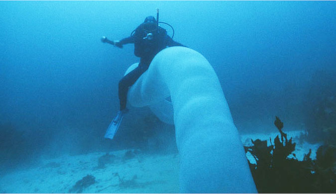 If the pyrosome wasn’t sucking in this water, it wouldn’t be able to keep its shape, just like when a windsock fills up with wind. The pressure coming out of its butt is also how these massive colonies move around, like if you were to eat a thousand pounds of bad mexican food and try to move across your kitchen floor without using your legs, if you know what I mean. According to the Nerdist, they are “so delicate, a gentle wave carries enough force to tear one apart.” Someone better tell the diver below that he’s riding a super rare, incredibly fragile colony of clones, quick.