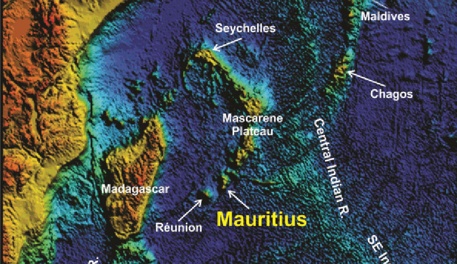 Topography of theIndian Ocean shows Mauritius, where researchers discovered a lost continent. Image: (Lewis Ashwal/Journal of Petrology/Oxford University Press