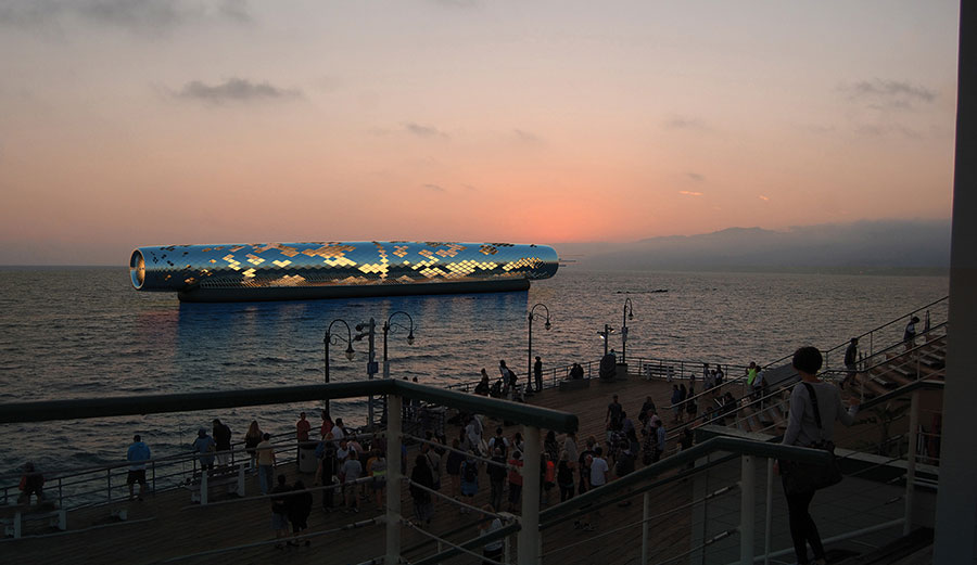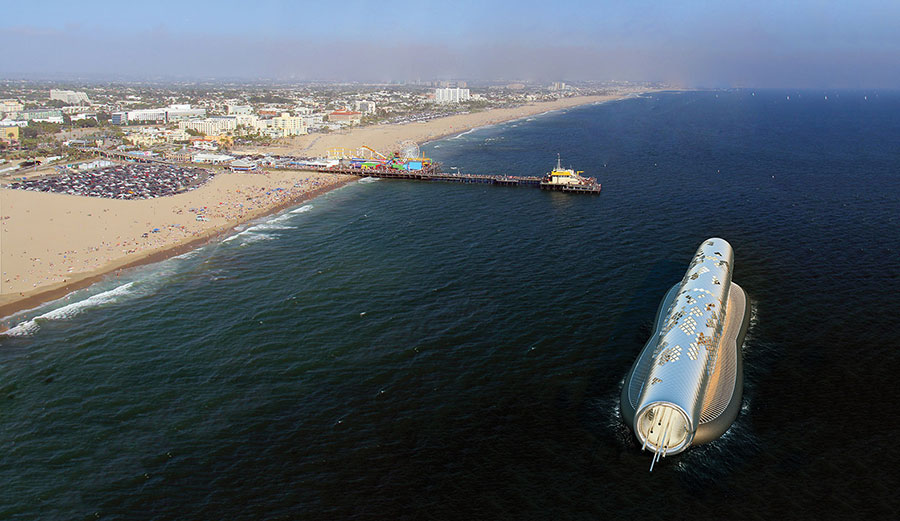 The Engineers claim that their design, which would be placed near the Santa Monica Pier, can generate 10,000 MWh and produce 1.5 billion gallons of drinking water per year. “What results are two products,” explained the team. “Pure drinkable water that is directed into the city’s primary water piping grid, and clear water with twelve percent salinity. The drinking water is piped to shore, while the salt water supplies the thermal baths before it is redirected back to the ocean through a smart release system, mitigating most of the usual problems associated with returning brine water to the sea.”