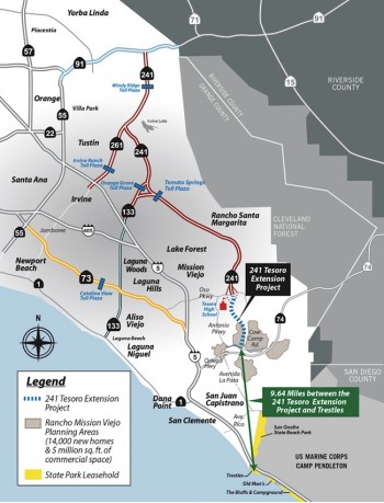 The SR 241 Tesoro Extension extends the 241 Toll Road by five and a half miles from its current terminus at Oso Parkway near Tesoro High School to Cow Camp Road within the approved Rancho Mission Viejo development, which is currently under construction. The 241 Tesoro Extension will serve as an important independent regional transportation facility for this development as well as provide an alternative to the congested Interstate 5 (I-5) and local arterial roads that are already at capacity in the San Juan Capistrano area. The extension will also offer drivers who travel the Ortega Highway from the Inland Empire another option to access job centers in the north. Construction of the 241 Tesoro Extension Project creates more than 2,400 jobs.