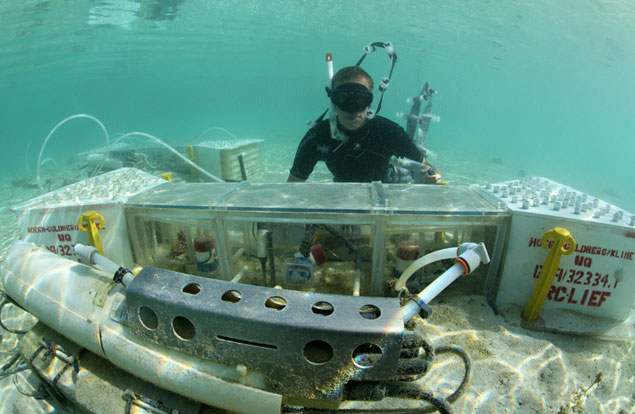 Living corals make their skeletal structure from calcium carbonate, which dissolves as the ocean becomes more acidic. Oceans absorb CO2 from the atmosphere to make carbonic acid in a process similar to making carbonated soda water. Unfortunately, humans are emitting an extraordinary amount of CO2, which is acidifying the oceans at the fastest rate in the Earth’s geologic history. This will have unknown and terrible consequences to ocean biology and all calcifying organisms in the sea.