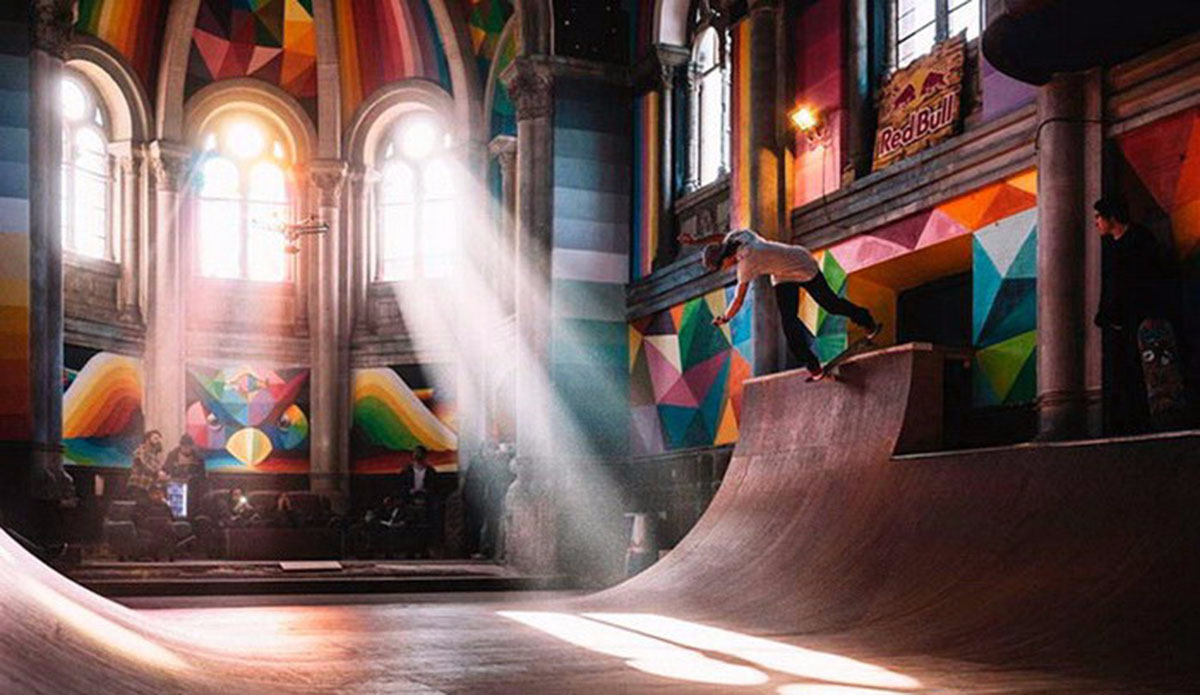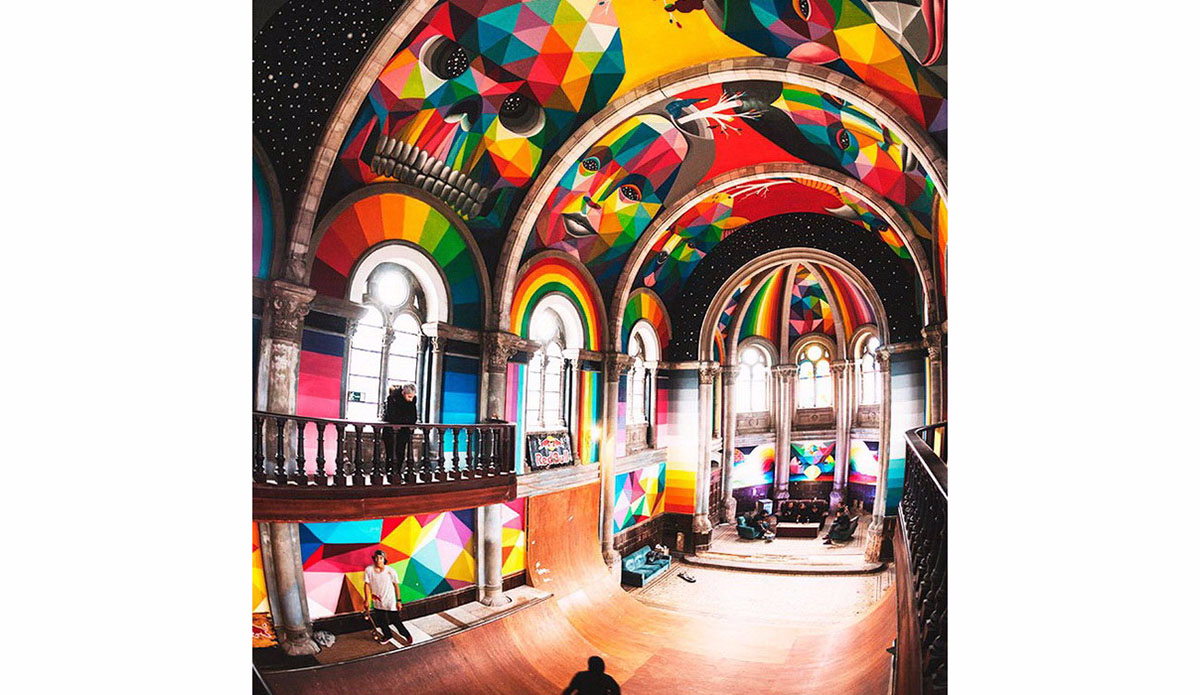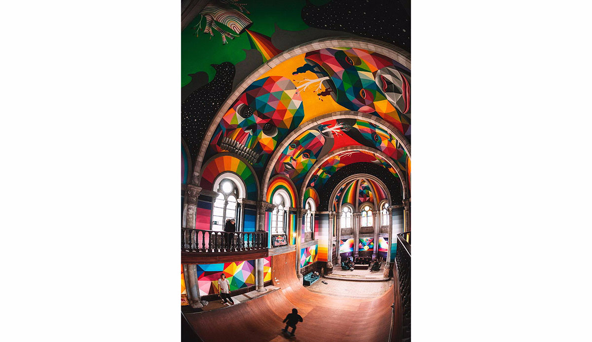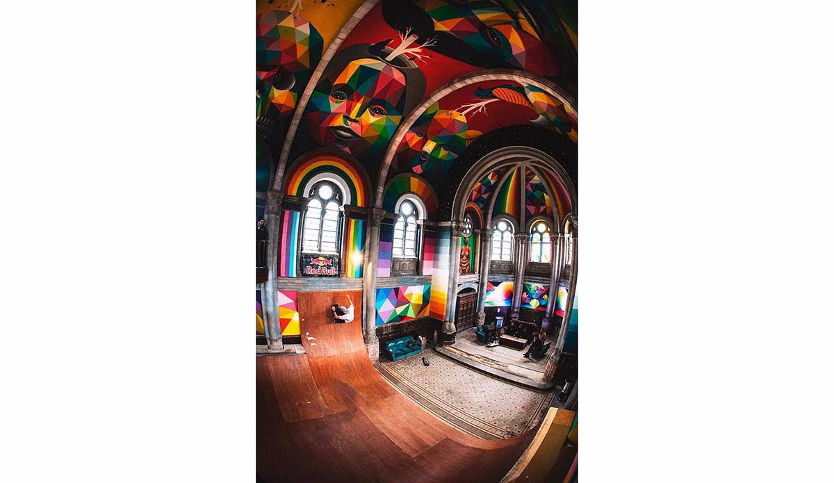 The church had been abandoned for years before a group called the Church Brigade teamed up with Red Bull and raised enough money to give the 100 year old building new life. Inside its walls they built a half pipe and turned Kaos Temple into the most unique skatepark in the world. To top it all off they commissioned artist Okuda San Miguel to paint the walls and vaulted ceilings, giving it a stained glass look with bright colors you’d only find inside a masterpiece cathedral. Okuda calls the final product his person Sistine Chapel.