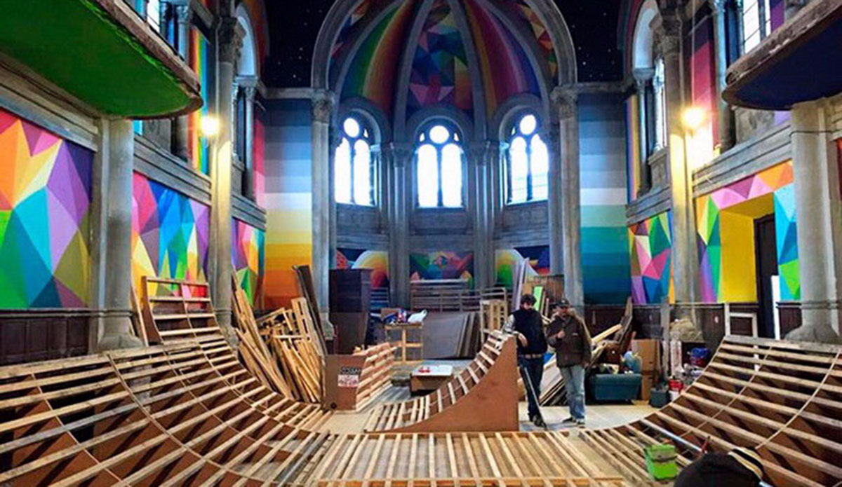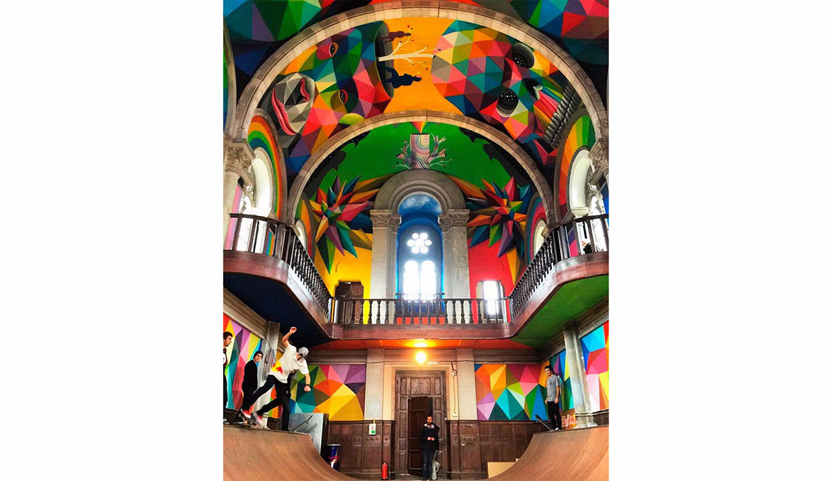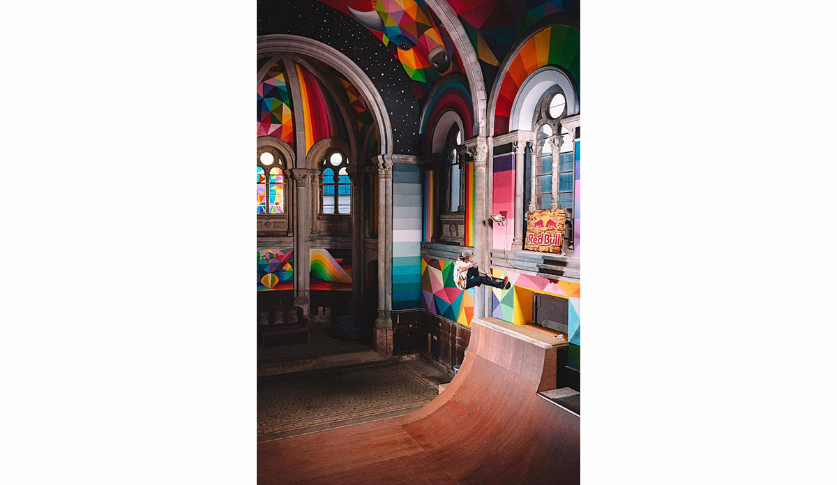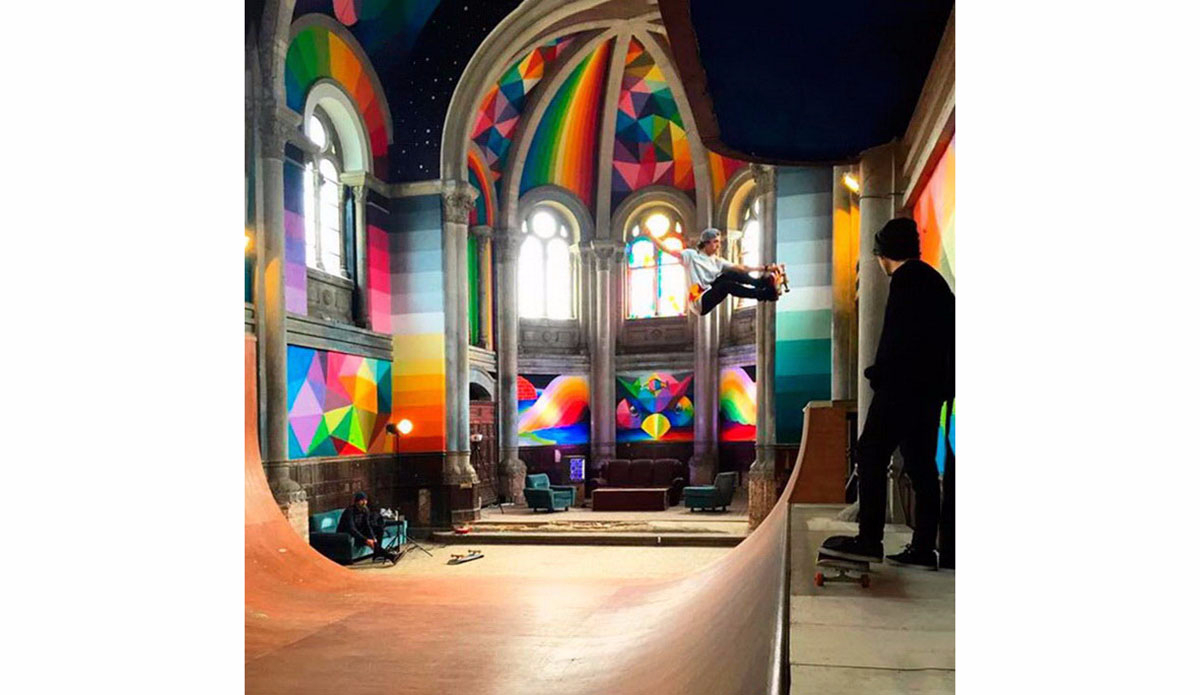 The church had been abandoned for years before a group called the Church Brigade teamed up with Red Bull and raised enough money to give the 100 year old building new life. Inside its walls they built a half pipe and turned Kaos Temple into the most unique skatepark in the world. To top it all off they commissioned artist Okuda San Miguel to paint the walls and vaulted ceilings, giving it a stained glass look with bright colors you’d only find inside a masterpiece cathedral. Okuda calls the final product his person Sistine Chapel.