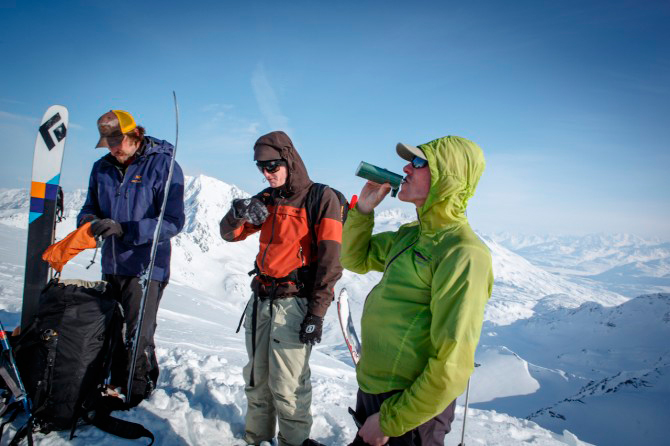 The crew enjoys some refreshments on the summit of cracked ice. The peaks in the background are what locals affectionately refer to as the “far-far gnar-gnar”. Photo: Spencer James