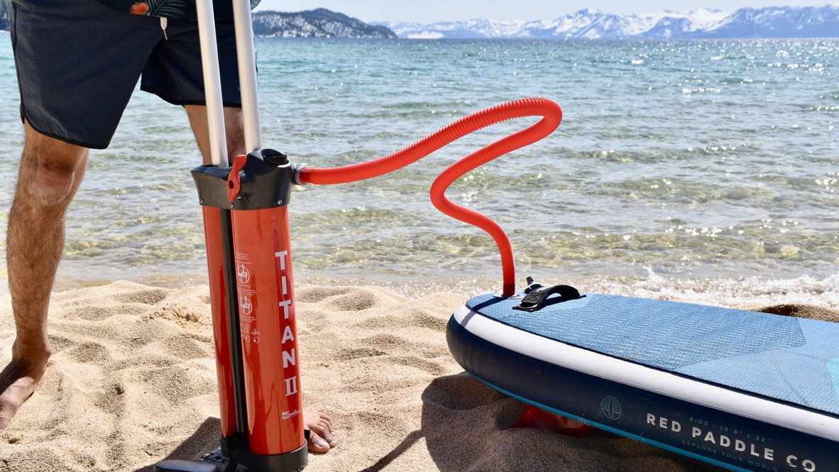 Inflating a paddle board by hand can take a good amount of time (10-15 minutes) and effort. Electric pumps make this process much easier! Photo: Rebecca Parsons//The Inertia