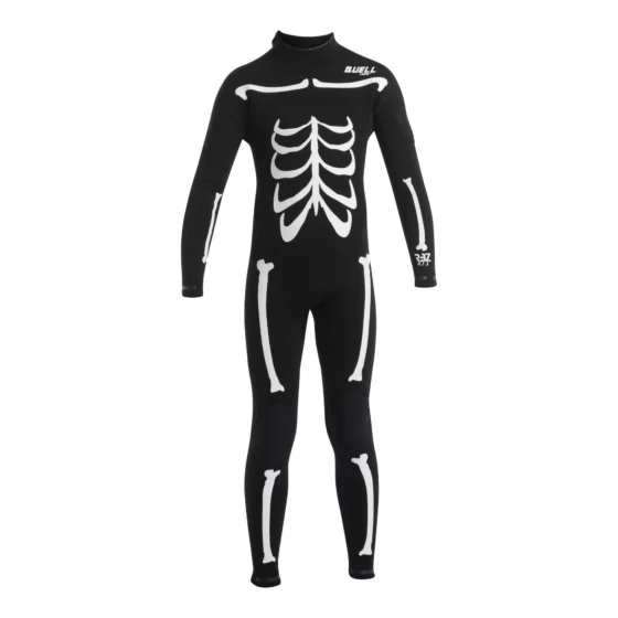The kids Buell RBZ Stealth Mode has all the features we look for in a good kids’ wetsuit. This suit is made from a warm but stretchy 4/3 mm material and has a soft interior lining throughout, solid seam construction with interior tape, and easy entry with a back zip and leg zippers. Another feature that makes this suit stand out is that it was the only back zip suit that had an extra layer of material on the inside back to prevent water entry through the zipper – this makes the suit slightly harder to get on and off but it’s still way easier than a front zip. This suit comes in a few different colors, including Buell’s popular skeleton design, which might be a no-go for some, but I found it to be cute on the kids and makes the suit fun for them as well.