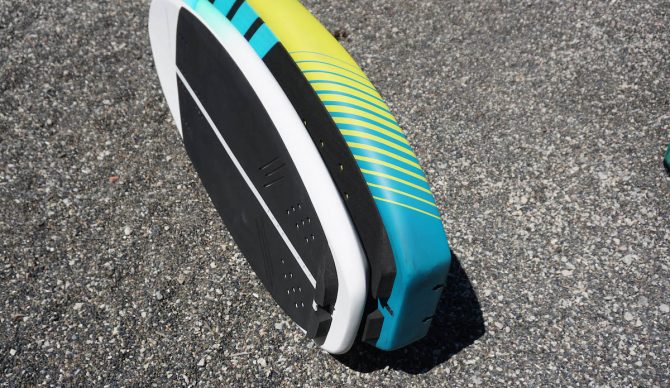 Boards like the Jimmy Lewis Flying VM or the Appletree/Omen Flux have a hull-shaped bottom that cuts through the water like the bottom of a boat, making for less sticky touchdowns – the product page for the Flying VM claims that the shape will “re-direct the rider back up onto the foil with little or no drag when they touch down,” and we have to admit there is a palpable difference between a flat-bottomed board and a board with a shaped hull. However, it’s worth keeping in mind that any sort of hull-shaped bottom will be tippier and less stable than a flat-bottomed board.