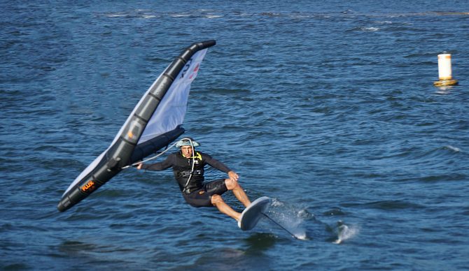 Midlength glide while wing foiling at Sherman Island. Photo: Ken Cox//The Inertia