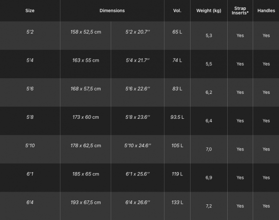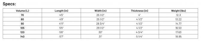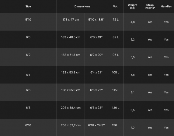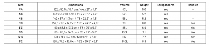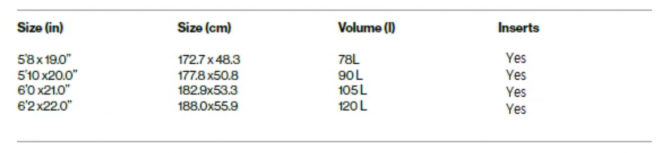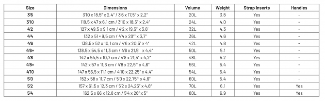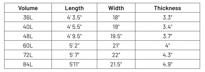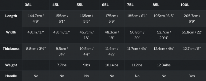 | Omen Flux | (60L): $1,770 | 36, 40, 48, 60, 72, 84 | Closed-Cell Foam/Full Carbon Layup | Closed-cell lightweight foam construction, fin-style carry handle |