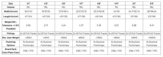 | F-One Rocket Mid 2025 | (72L): $1,899 | 72, 82, 95, 105, 115, 130, 150 | Bamboo deck | High volume but high performing |