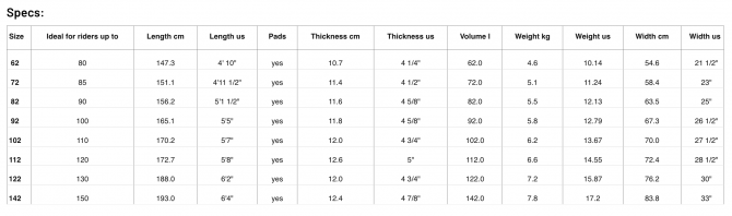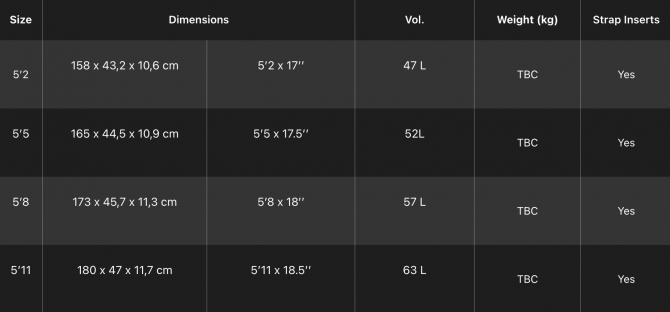 | Jimmy Lewis Flying VM | (60L): $1,899 | 60, 75, 85, 95 | PVC Sandwich with Carbon Reinforcement | Bottom contour designed to reduce stickyness when touching down |