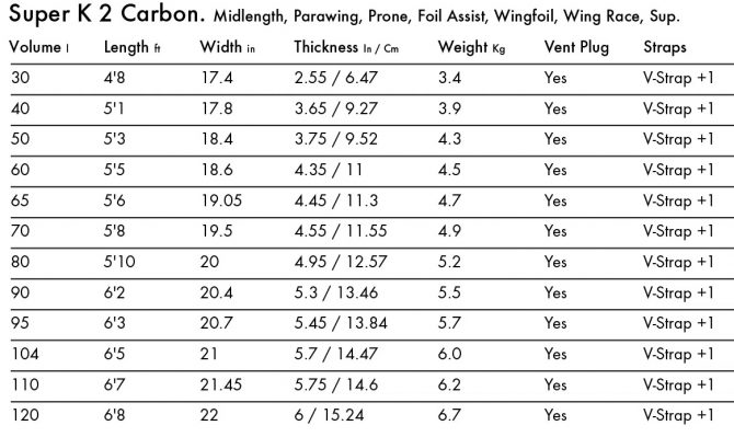 | KT Drifter Super K 2 | (60L): $2,006 | 30, 40, 50, 60, 65, 70, 80, 90, 95, 104, 110, 120 | Carbon Monocoque | Flat bottom, hull-shaped nose |