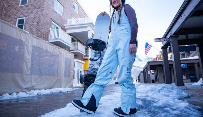 Lightweight material and plenty of pockets are defining features of the Burton Kimmy Bibs. Did we mention that they’ve also got style? Photo: Jack Loosmann/The Inertia