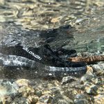 looking downward at the Danner Rivercomber water shoes while walking through a river with a rocky bottom.