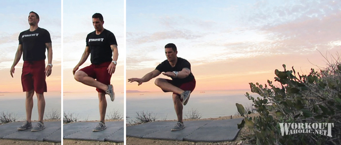 Purpose: To increase blood flow to activate the gluteus resulting in increased power for maneuvers. Begin by standing tall and place one ankle above the opposite knee. Then, slowly sit back with your hips. As soon as you feel a stretch in your glutes, return to standing. You may place your hand against a wall or a car to ensure balance is maintained.