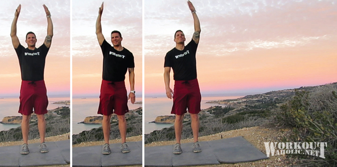 Purpose: Opens up the chest and stretches the pec’s and warms up the shoulder girdle. Begin with arms extended to a T, then hug your arms across your chest then return to starting position.