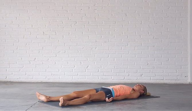 Lie down on your back for 5 minutes of integration and meditation. Let your feet come as wide as the mat and fall open. Relax your arms, palms facing up and tuck your shoulder blades underneath you. Close your eyes.