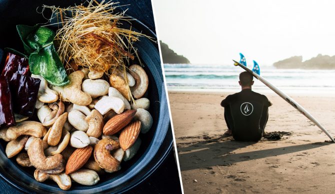 So, does surfing have a superfood? Bananas are a good start, paired with a complex carbohydrate like wholegrain bread. But your body is also going to need protein as well as more vitamins and minerals for optimal body functioning and recovery. Of all things, I make the case that nuts are actually the perfect go-to. They are a powerhouse of energy; highly prized for their protein, vitamins, minerals, and healthy monounsaturated fat content. Pound for pound, they’re food that punches in well above their weight. For example, almonds contain 20 percent more protein of the equivalent weight of just one egg.