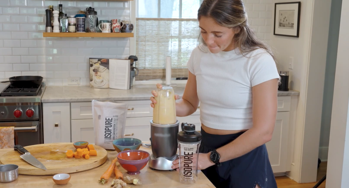 The recipe included one frozen banana, a cup of frozen mango, a peeled orange, a quarter cup of chopped carrot, a half-inch piece of fresh ginger, half a teaspoon of ground turmeric, a pinch of black pepper, and two scoops of Isopure Unflavored Protein — and some water. Ellie loves to sip on this smoothie before heading out for a paddleboarding session or a stroll across Pitt Street Bridge to catch the evening light.