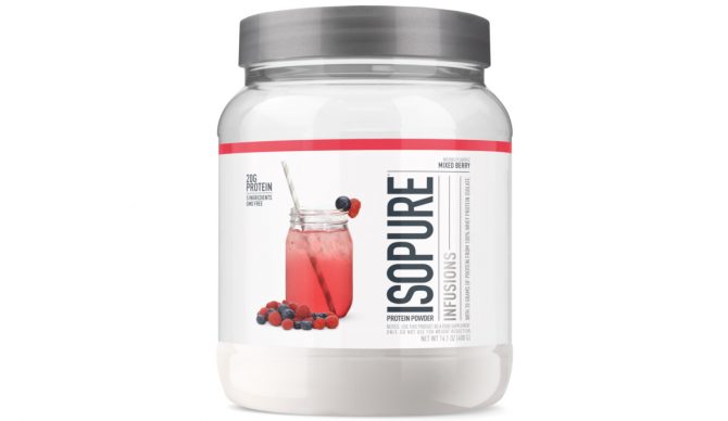 Isopure makes Infusions and powders that contain at least 20 grams of 100 percent Pure Whey Protein Isolate. Isopure Infusions come in several fruity flavors that pair well with water as well as more dessert-like flavors.
