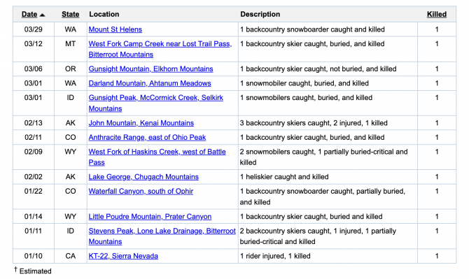 Seven skiers, two snowboarders, three snowmobilers, and one other person were among the total fatalities on the CAIC list from this season. Skiers and snowmobilers typically account for a bulk of avalanche-related deaths in the U.S.