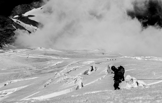 Zach at it again, with Brandon this time. Our first roped glacier obstacle as a team was the Emmons-Winthrop Glacier on Rainier’s northeast face. Camp Schurman at Steamboat Prow was a real treat, the coolest little perch, stashed safely amongst three grinding glaciers. Rainier is iconic, you can see it from most anywhere in coastal Washington as long as the day is clear. An alpine start put us astri the summit at 10:30 or so; 5,000 feet is a big climb even in near-ideal July conditions.
