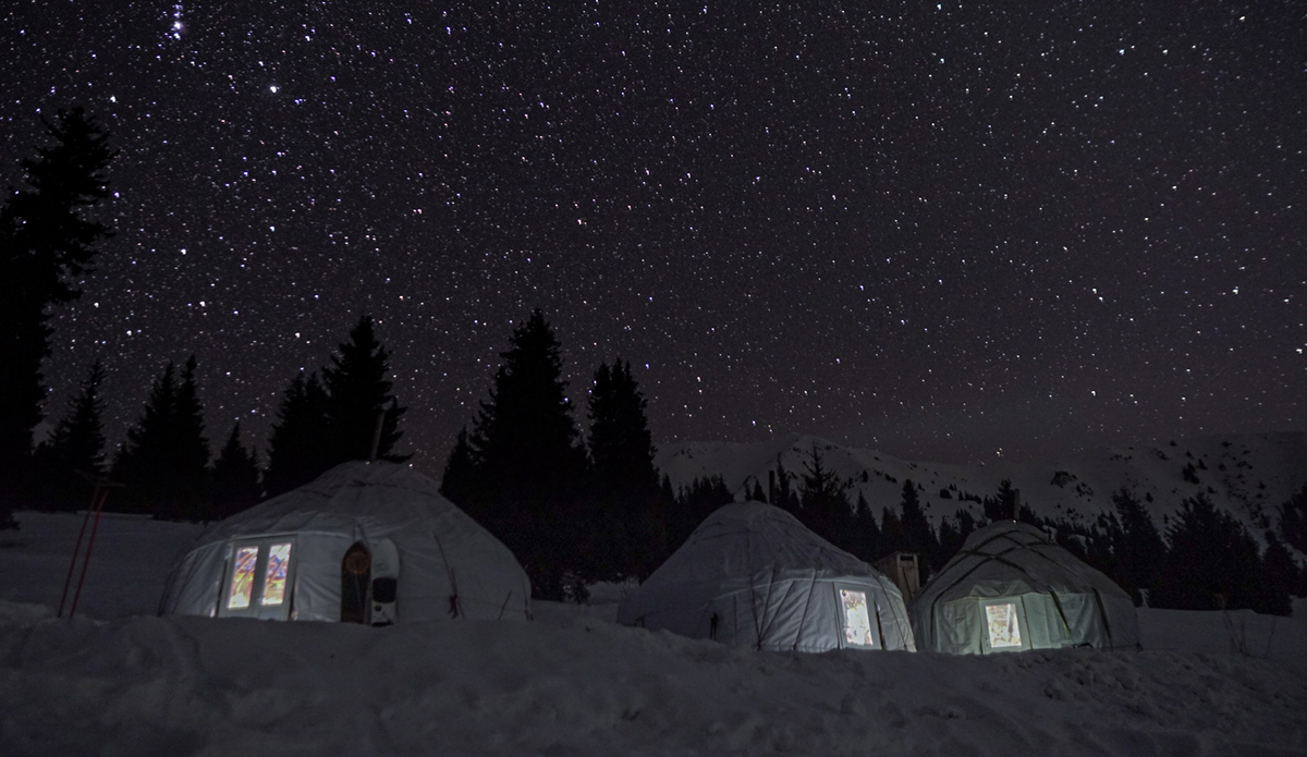 We really sunk our teeth into everything the zone had to offer, shredding from bell to bell every day and returning to cozy yurts as the sun sank behind the distant Kazakh skyline. It is hard to overstate how cool of an experience living in a yurt for weeks on end was, fully immersed in the mountains. There are a few places in the world where we imagine standing on top of a 1,500- or 2,000-foot run and being able to see all the way to the bottom. Alaska and the Alps immediately come to mind, but Kyrgyzstan is one of those places as well. Standing at 11,000 feet and peering into the distance at mountains towering above the one I stood on left me dreaming of future expeditions. But those thoughts were quickly replaced by a flow state as I dropped into untouched slopes of powder with giddy friends waiting below.