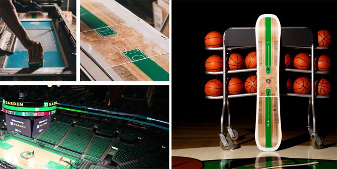 Burton was of course birthed in New England and the late Jake, wife Donna, and the fam have been season ticket holders at the Garden for nearly 30 years, which of course means employees have probably gotten the trickle down effect for unused seats for that long – making for an office full of Celts fans. Thirty years, that’s some serious history including that nasty Pistons rivalry, some short shorts, some long shorts (then back to short shorts) – characters like Parish, McHale, Doc Rivers, KG, etc. etc. And, lest we forget, a whole lot of parquet flooring. Parquet flooring that was actually used in the construction of these sticks. Seriously.