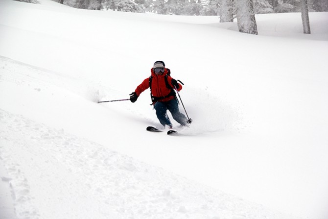 And the real moral of the story? You don’t have to get all gnarly to go in the backcountry. Or to enjoy it. There’s so many ridgelines in this world with incredible fall lines that are covered in trees with limited open exposure to allow for blower powder turns in a remote setting (i.e. nobody within 100 miles). We accessed one of our all-time favs for this test: south facing, only good when it’s storming. Next to zero exposure to open, extended terrain that’s dangerous. With a pitch that meanders perfectly between 37 and 27 degrees. Rippable in snow up to 24 inches (otherwise it’s too much snow). Admittedly, these safe places are like sacred surf breaks that no one talks about. Only difference is there’s thousands of crowd-less, undiscovered lines out there just waiting to be skinned.