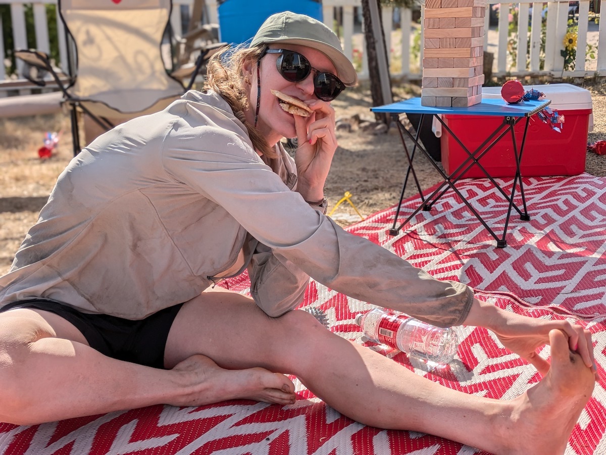 Lowest moment: I was camping at an RV campsite on a Friday night and was trying to go to bed at 7 p.m., just exhausted and done. But the RV next to us was not going to bed at 7. It’s like 10ish, and they’re bumping! And I’m sitting in my tent crying because I’m just so tired. I just want to go to sleep! Trail rules don’t apply to everybody else in the real world. But I was just so tired.