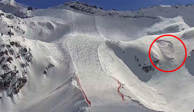 ScrThe slide can be seen to the right (skier’s left) of the groomed trail. Photo: Screenshot//Reddit