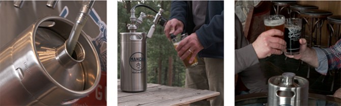 Developed by home brew expert and engineer Kevin Lehman, the Man Can is available in gallon, or half-gallon, stainless steel containers that are easily packable. It also features two pouring systems: a tap-like pour for your Superbowl Parties at the house, or in a traditional keg tap perfect for outdoor parties or parties along the trail. The system also comes with a CO2 holster. The ManCan retails for around $200, depending on the choice accessories one chooses to go with it.