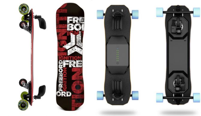 The Freebord (L) vs. the LEIFTECH eSnowboard (R). The same, but different.