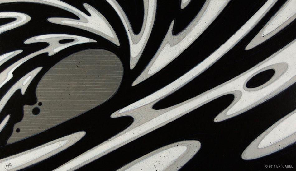 Elements from inspirations such as the ocean, ancient civilizations, cycles of nature, plants, symbols, systems, and mid-century design are combined to create visually pleasing works of art. Abel notes, “I strive for a visual balance in my work, making art is a form of therapy for me. I’m a pretty simple guy, I like to create things that make me feel good and are pleasing to my eyes and my insides. I don’t paint to express my disgust in politics, or pollution or world affairs… it’s actually the opposite, I paint to help me cope with my disgust in politics, pollution and world affairs. Making art just takes me to that happy place where everything is good.”