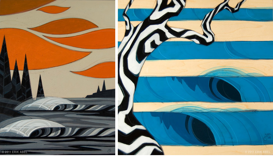 Being heavily influenced by and involved in the surf/skate/snow sports industry and working as a freelance graphic designer and Art Director for over 15 years, Abel’s method of bold, graphical imagery fused with his loose brush, pen and pencil work seems to find a growing niche of its own in the fast rising “Urban Contemporary” art movement. Among the clients his style has attracted are Billabong, Oxbow, Reef, and Surfing Magazine.