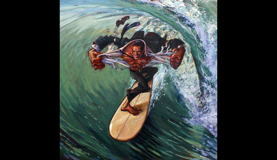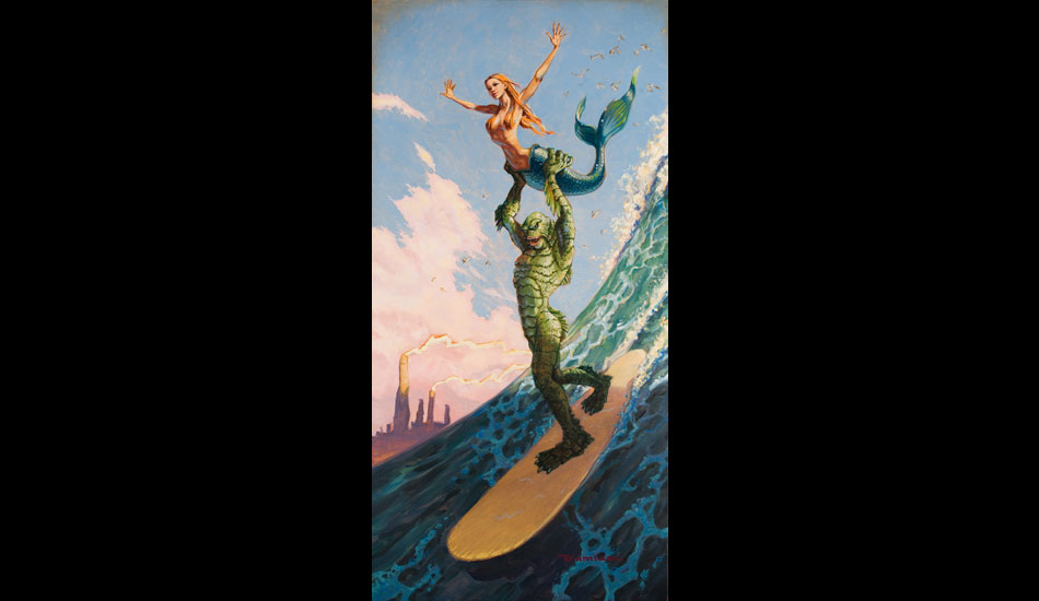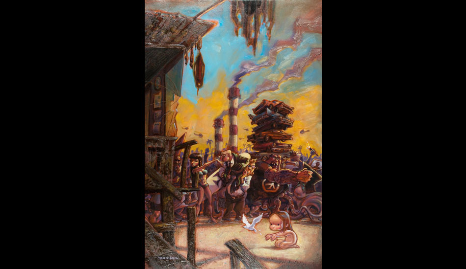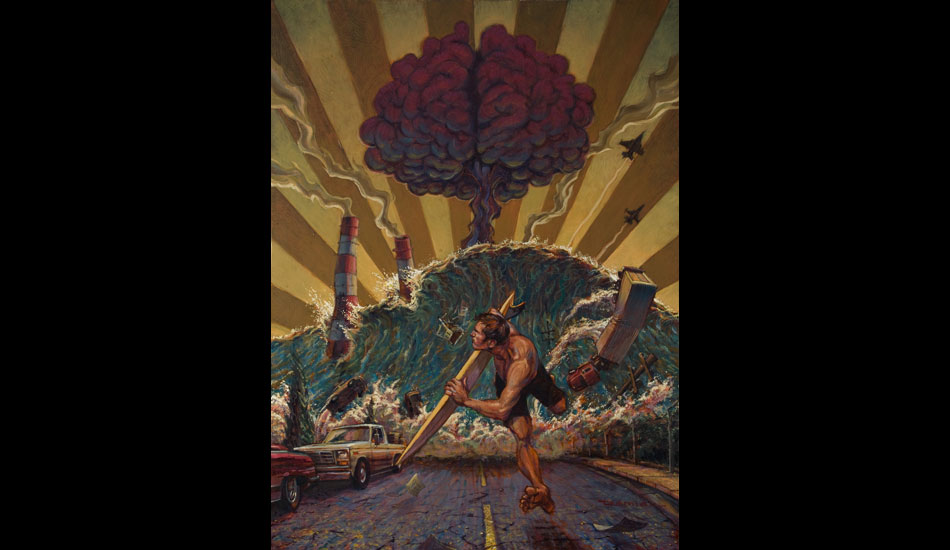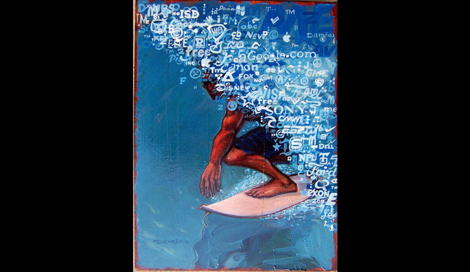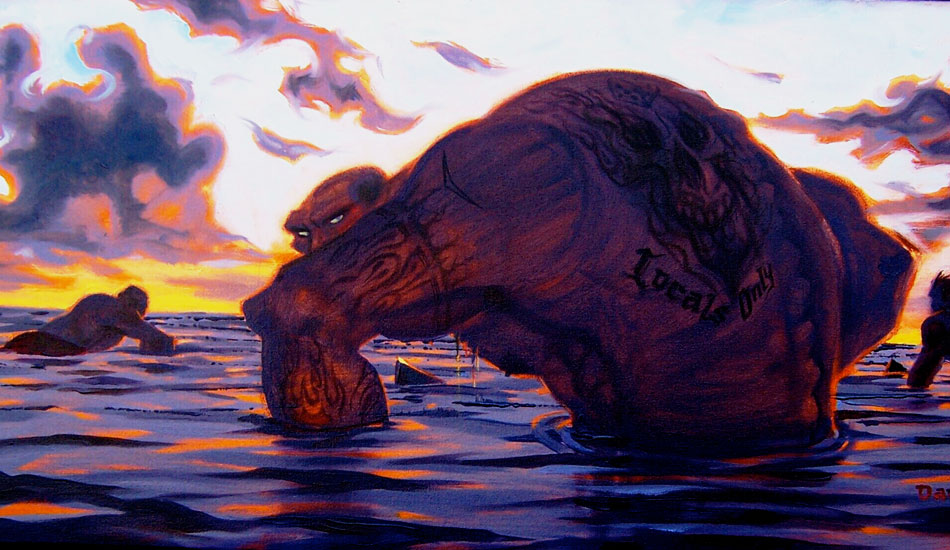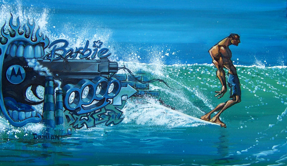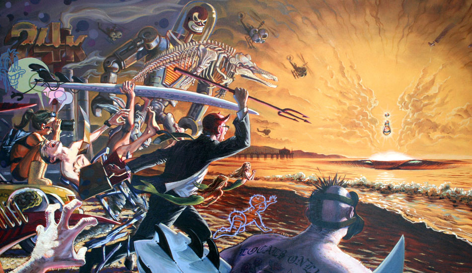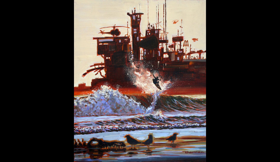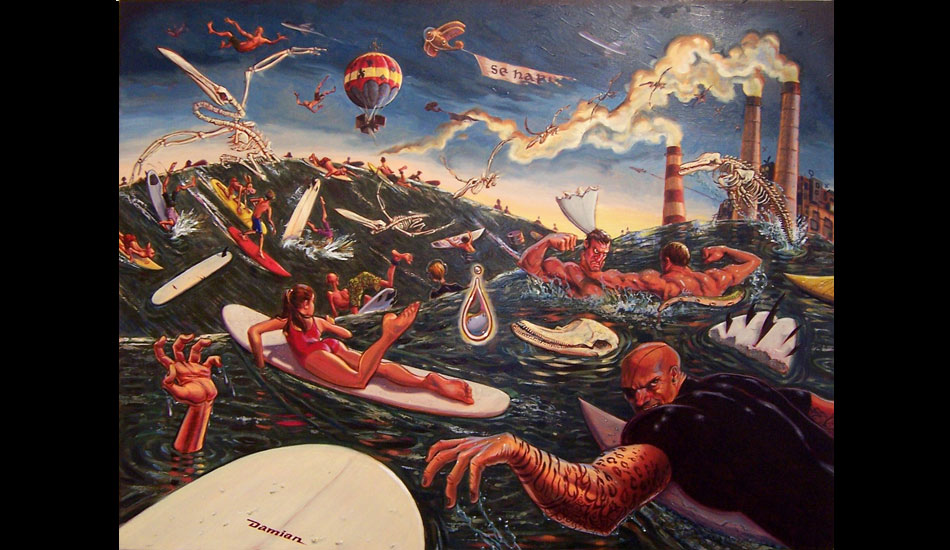 You won’t find any serene beach scenes in the paintings of Los Angeles artist Damian Fulton. His world, crammed with battling surfers and billowing smoke stacks, reflects his long tortured romance with dysfunctional urban-coast life.