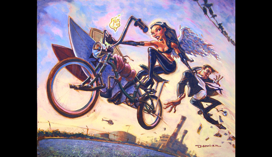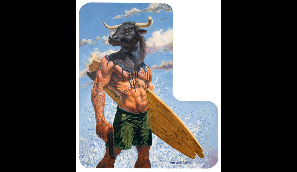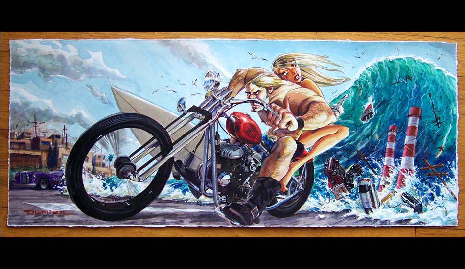 The proximity of one of the world’s most diverse and congested cities to the Pacific provides fertile material for Damian’s unique take on the California dream. Car chases, surfer girls with guns, noir nostalgia, a visual narrative that reads like conceptual art for a drama filled surf movie. Damian’s twisted ride down PCH presents a chaotic seaside culture, where Surf City is way more Gotham than groovy.