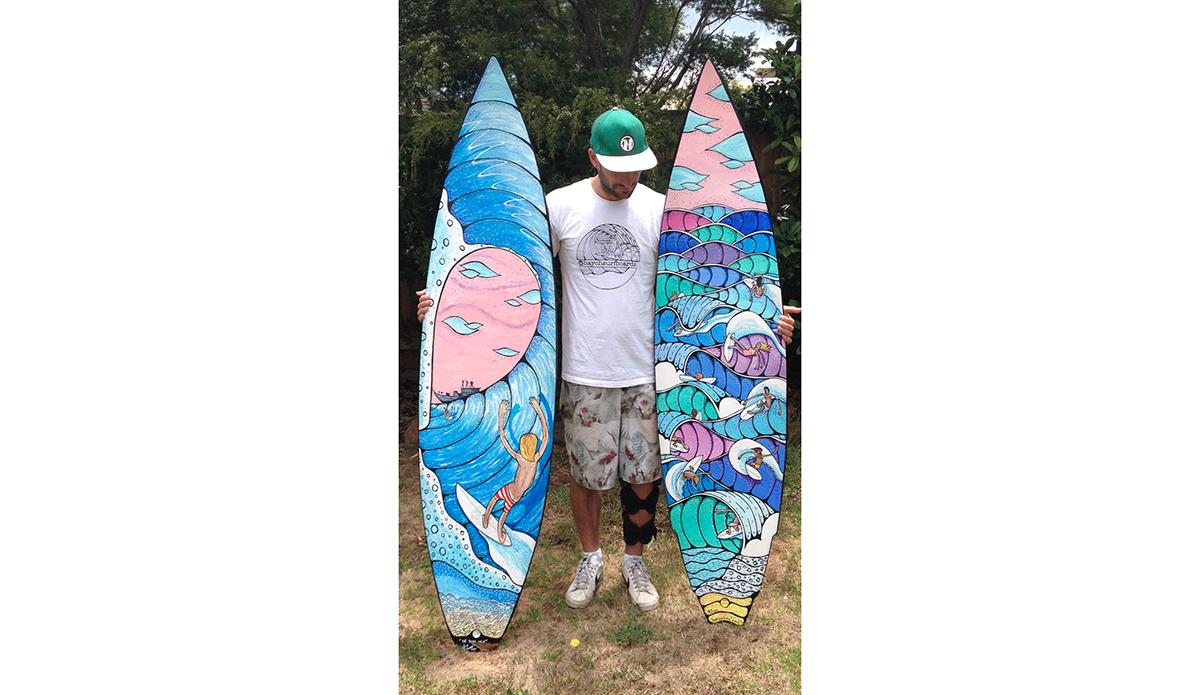 My art been describes as “capturing the emotion and memories of moments in surfing” and I try to create the feeling I get from surfing in my artworks using vibrant colors and stylized characters.