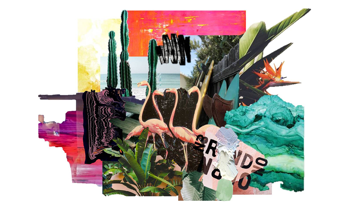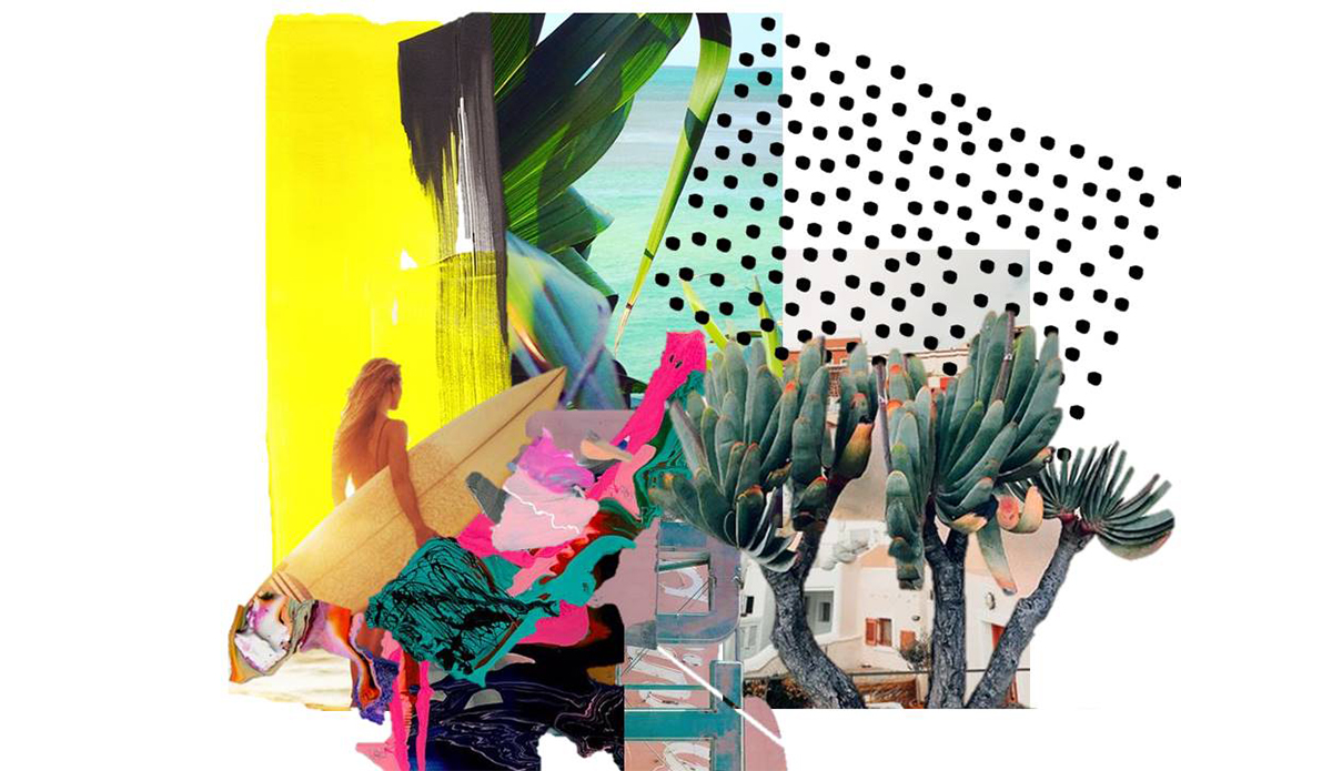 From deep inside my imagination, I build intricate pieces where my surfing background and hometown are always present. Collages are part of my universe, with contrasting patterns put together to form a new shape and new lines that reveal an exotic, “crumbled” image.