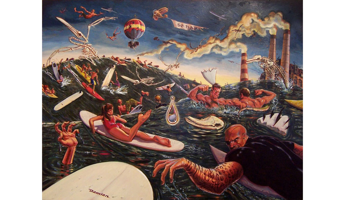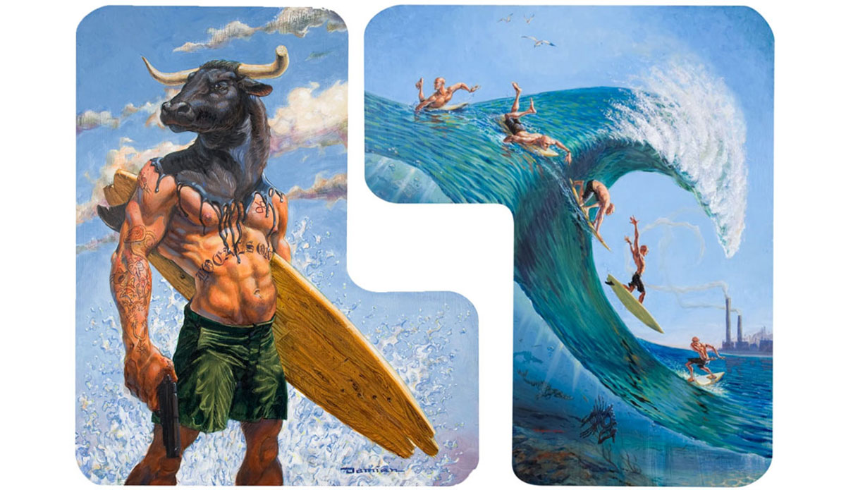 “When I first saw Damian Fulton’s ‘Cacophony in Sea Minor’ it changed me, and it changed my appreciation of what an artist could do for me,” John said. “After growing up in the suburbs of the South Bay of Los Angeles, I moved to the city and quickly became urbanized. But I always returned to the ocean to pursue my love of surfing. As times changed and huge crowds flooded the coast and the line-ups of Los Angeles, it became virtually impossible to avoid the confluence of urban blight with surfing culture. Damian brings his immense talent and skill and vivid imagination and humor to create worlds on canvas. of fantasy and reality dueling for my attention. I can personally identify with every image he juxtaposes in these paintings. From riding motorcycles and shooting guns to fighting in the surf, to a love of monsters and a fear of tsunamis. The smokestacks I’ve surfed between, the beautiful women, and the combination of Hollywood’s influence into the surfing culture of Southern California—I just can’t get enough of it.”